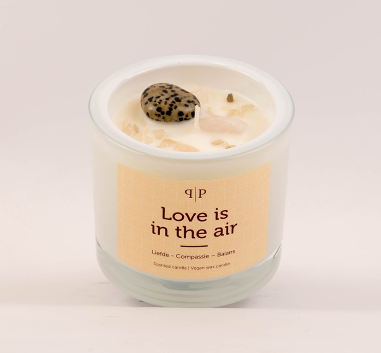 De Love is in the air geurkaars is gevuld met rozenkwarts en dalmatiër jaspis. Rozenkwarts is bij uitstek de steen van het hart en de liefde. De steen opent het hart om liefde te ontvangen en om liefde te geven. De steen trekt harmonieuze liefdes- en vriendschappelijke relaties aan en bevordert ook eigenliefde en zelfacceptatie. Dalmatiër jaspis maakt je oprecht en eerlijk en zorgt voor balans in lichaam, ziel en geest.