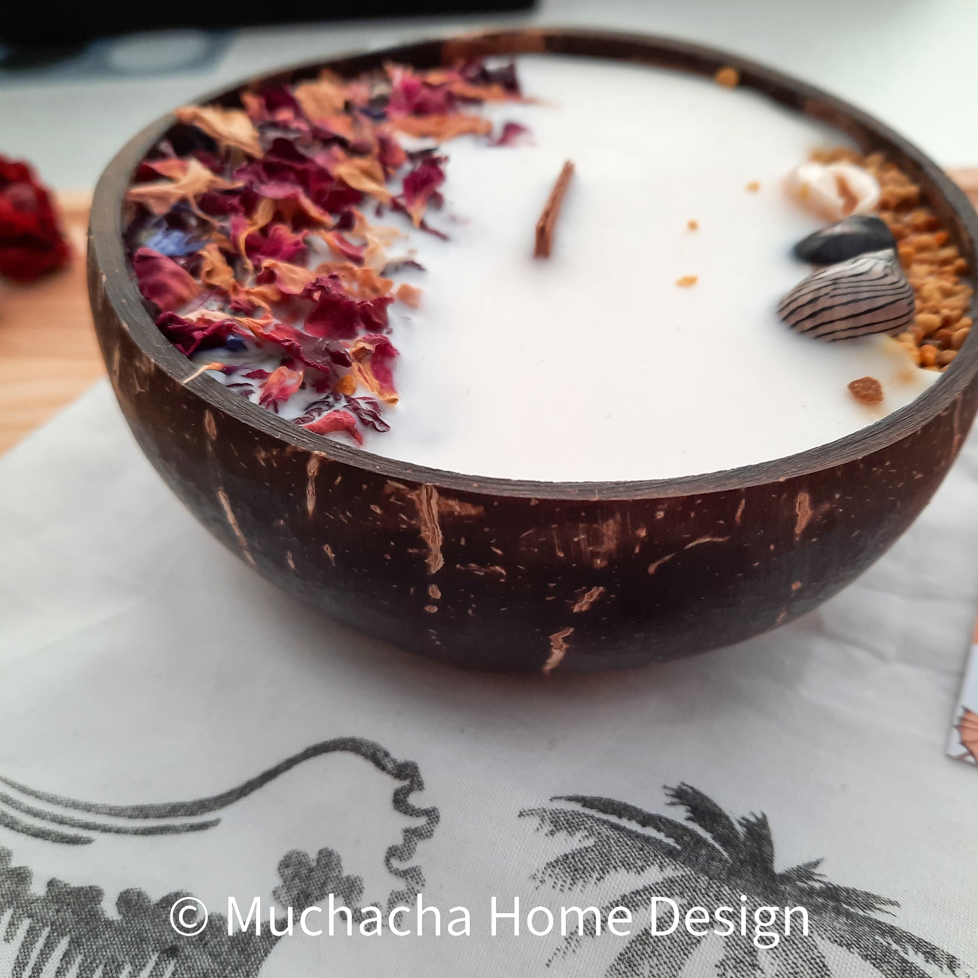 Alle kaarsen zijn versierd met gedroogde bloemen, echt schelpen en stuifmeel. Het heeft een beklede houten lont die knettert als hij brandt. Als de kaars op is, kun je de kokosnootschaal hergebruiken als decoratief object.