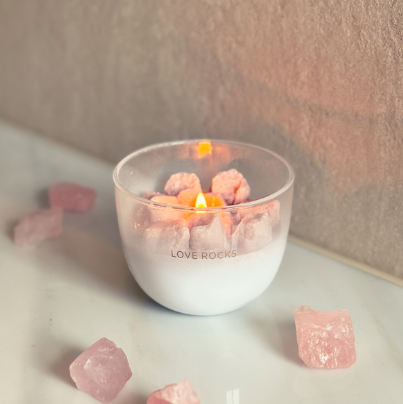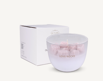 De Love Rocks kaars is hét symbool van liefde, vriendschap en warmte. De zachte roze tint wax combineert met onze exclusieve geur Green Tea Time – fris, zacht en ontspannend.