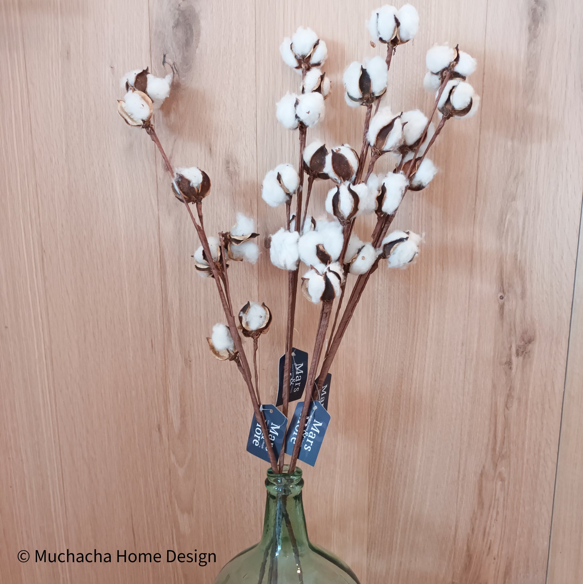 Op de foto zijn de katoentakken gedecoreerd in een mooie destilleer vaas. Er zitten 4 takken in de vaas. Vaas niet inbegrepen in prijs. Prijs per tak.