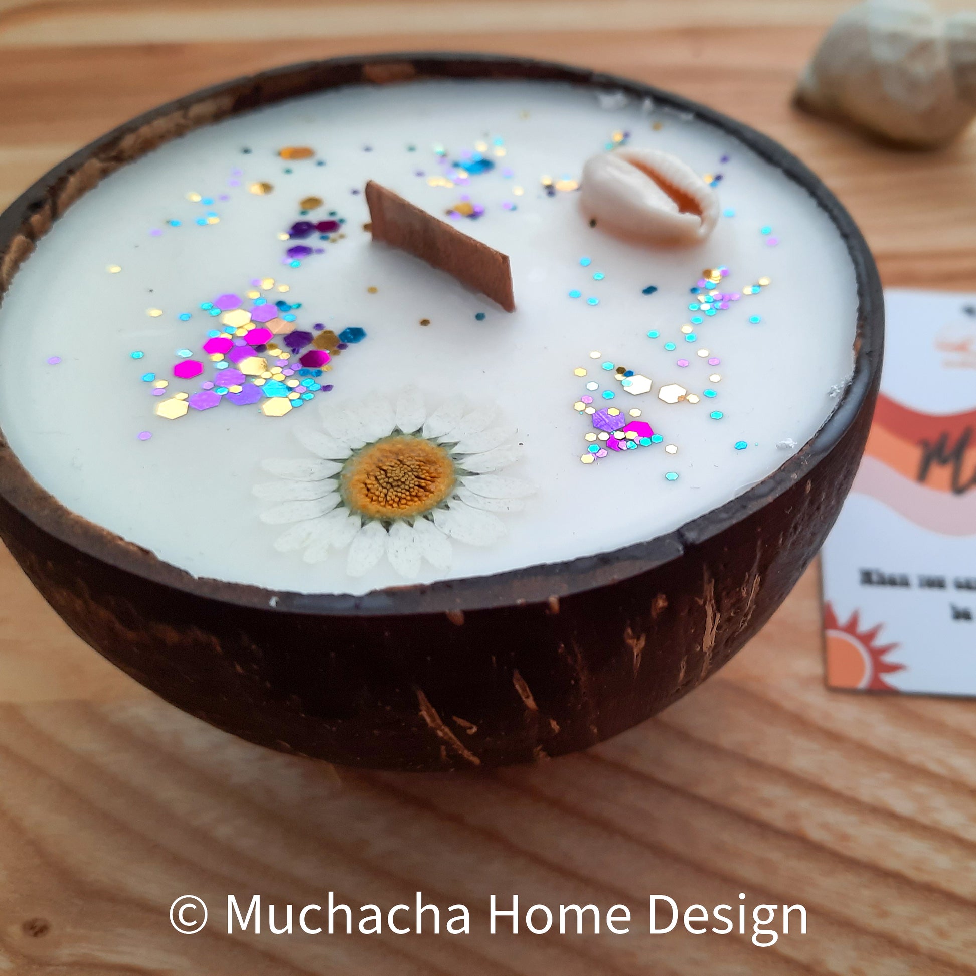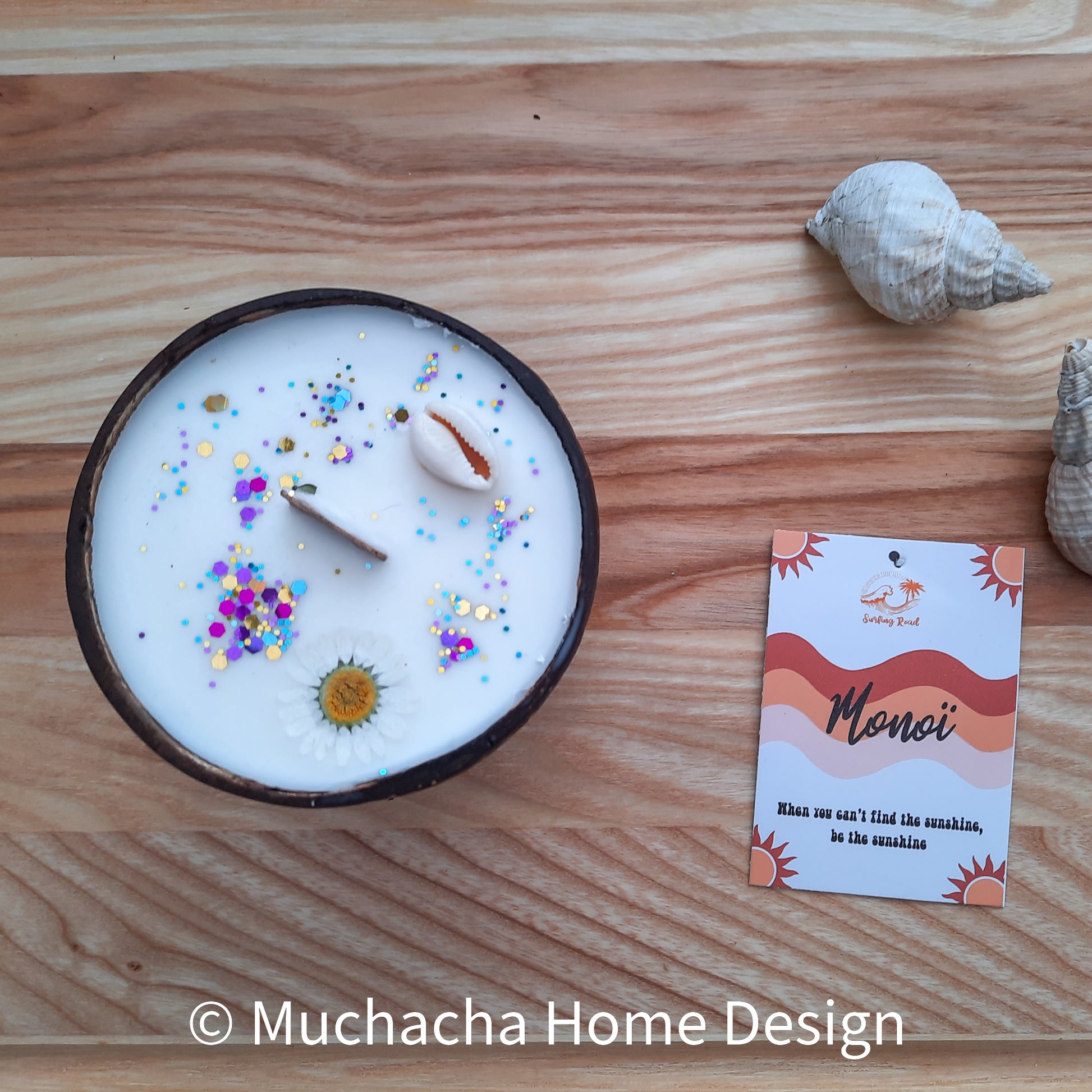 Sfeervolle kaars die het huis vult met de heerlijke geur van monoï, een unieke en exotische bloemengeur die wordt gemaakt door bloemen van de Tahitiaanse tiare bloem te weken in kokosolie. De geur monoï brengt de tropische geur van zonnecrème binnen in je woonkamer. Alle kaarsen zijn versierd met gedroogde bloemen, echt schelpen en stuifmeel. Het heeft een beklede houten lont die knettert als hij brandt. Als de kaars op is, kun je de kokosnootschaal hergebruiken als decoratief object.
